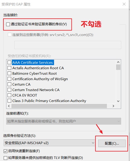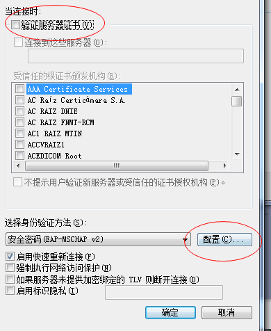 5、在设置框中,取消选择“验证服务器证书”,并单击选择身份验证方法的“配置”按钮。