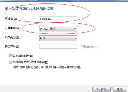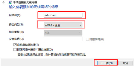 6、网络名输入“eduroam”,安全类型选择“WPA2-企业”,加密类型选择“AES”,安全密钥不填,点击“下一步”;