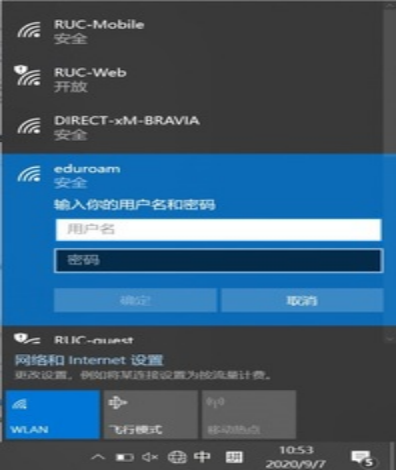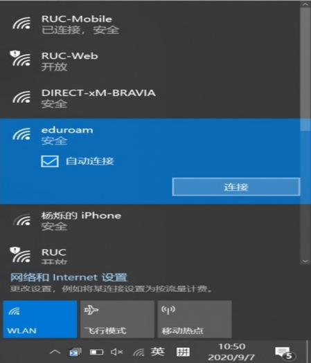 选择无线信号“eduroam”,点击“连接”。按照提示输入eduroam账号和密码,点击“确定”。选择“连接”,成功连接。