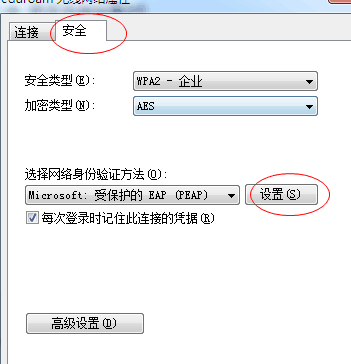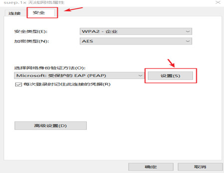 8、选择“安全”选项卡,选择网络身份验证方法为“Microsoft:受保护的EAP(PEAP)”,其余保持默认设置,点击“设置(S)”;