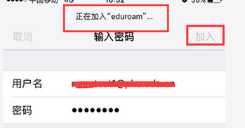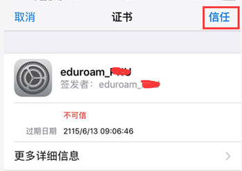选择连接“eduroam”,在相应位置按照eduroam账号格式输入用户名和密码,然后点击“加入”;在“证书”界面选择“信任”。