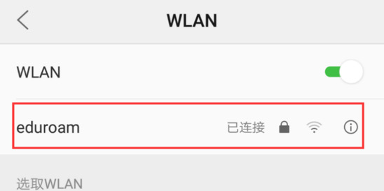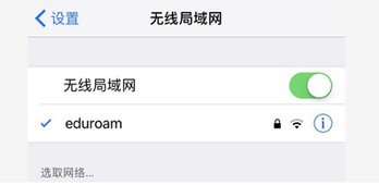 打开“设置”,启动“WLAN”, 点击“WLAN”,查看搜索到的“eduroam”的SSID。 点击搜索到的“eduroam”进行配置。