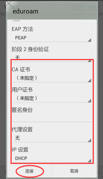 “EAP方法”选择PEAP,“阶段2身份验证'选择“无”;“CA证书”和“用户证书”无需选择; “匿名身份”无需填写; 代理设置选“无”, 信息填好以后,点击“存储”或“连接”,则会自动连接eduroam进行认证。若弹出证书确认窗口,选择“是”。 认证完成后显示“已连接”,此时可以正常上网。