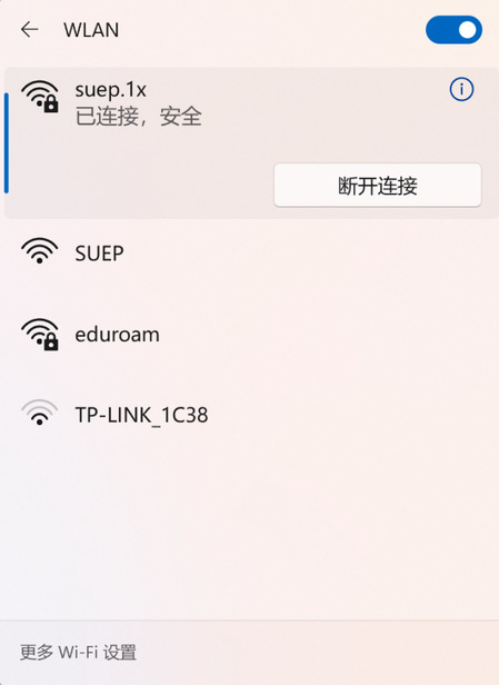 6)等待显示suep.1x已连接,即可开始使用无线网络。