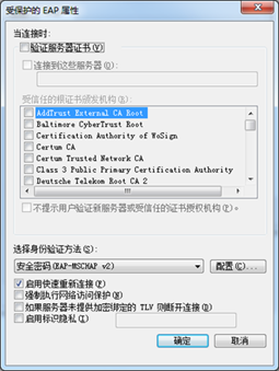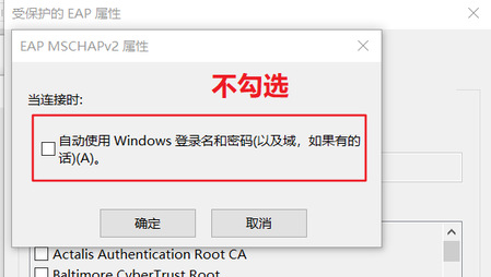 4)点击“设置”进入“受保护的EAP属性”设置,不勾选“验证服务器证书”;点击“配置”进入“EAP MSCHAPv2属性”设置,不勾选“自动使用Windows登录名和密码”;