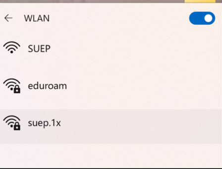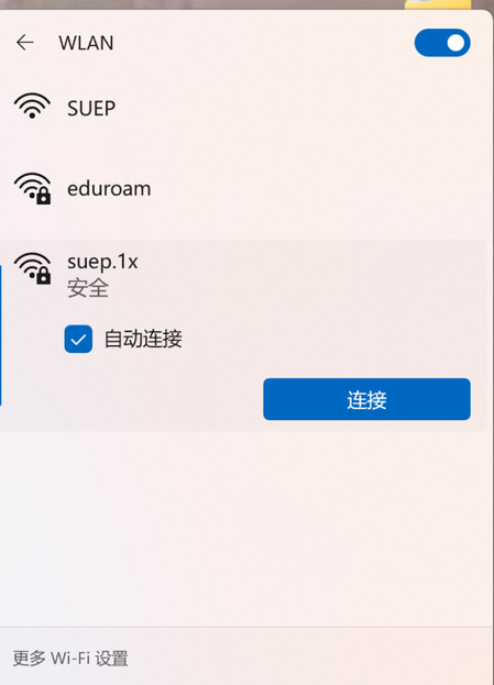 11)在无线网络列表中选择“suep.1x”,点击“连接”,首次连接会弹出登录框,输入您的无线网络账号信息,点击“确定”,等待显示“已连接”,即可开始使用无线网络。