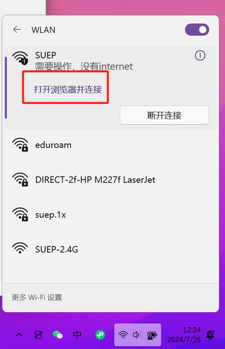点击电脑右下角网络图标打开网络选择列表,等待搜索到SUEP/SHIEP信号,选择并点击“连接”,打开浏览器会自动跳转至认证页面,若未自动弹出,则手动打开浏览器地址栏并输入https://xyw.shiep.edu.cn,在弹出的认证界面使用校园统一身份认证账号进行登录。