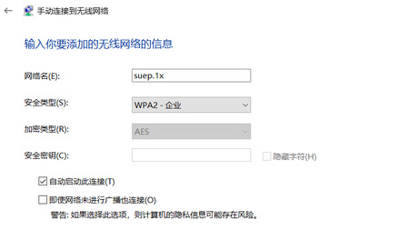 6)网络名输入“suep.1x”,安全类型选择“WPA2-企业”,加密类型选择“AES”,安全密钥不填,点击“下一步”;