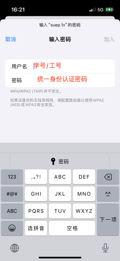 2) 点击“suep.1x”,在用户名和密码栏输入统一身份认证的学(工)号及密码,点击“加入”。