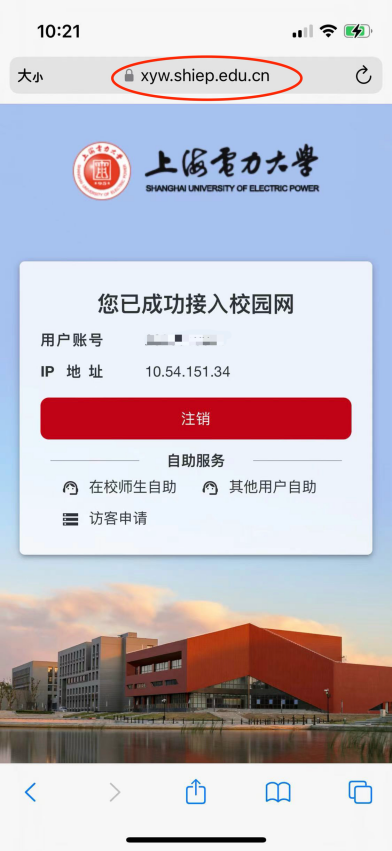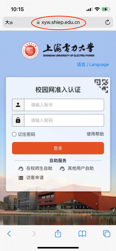 3)在连接过程中可能偶尔遇到不会自动弹出认证界面的情况。此时可以在连接SUEP/SHIEP后,手动打开手机浏览器地址栏并输入https://xyw.shiep.edu.cn,在弹出的认证界面进行认证即可,如下图.