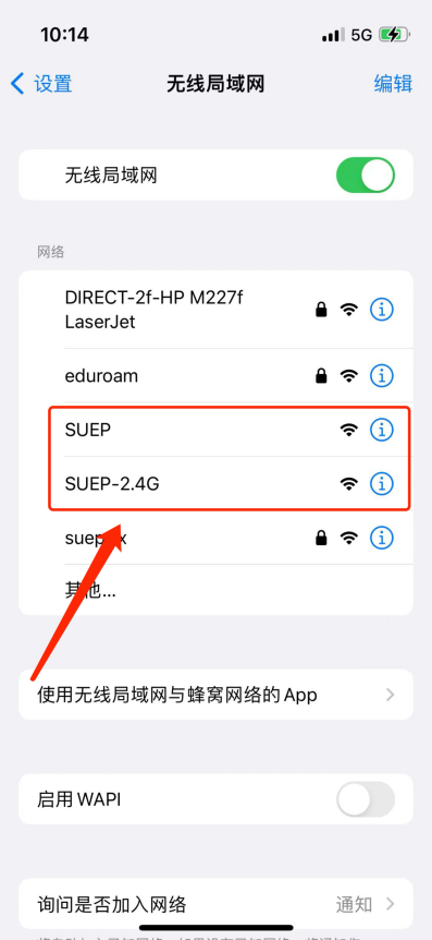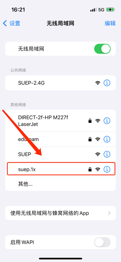 1) 打开“设置”——“无线局域网”,等待搜索到“suep.1x”信号。