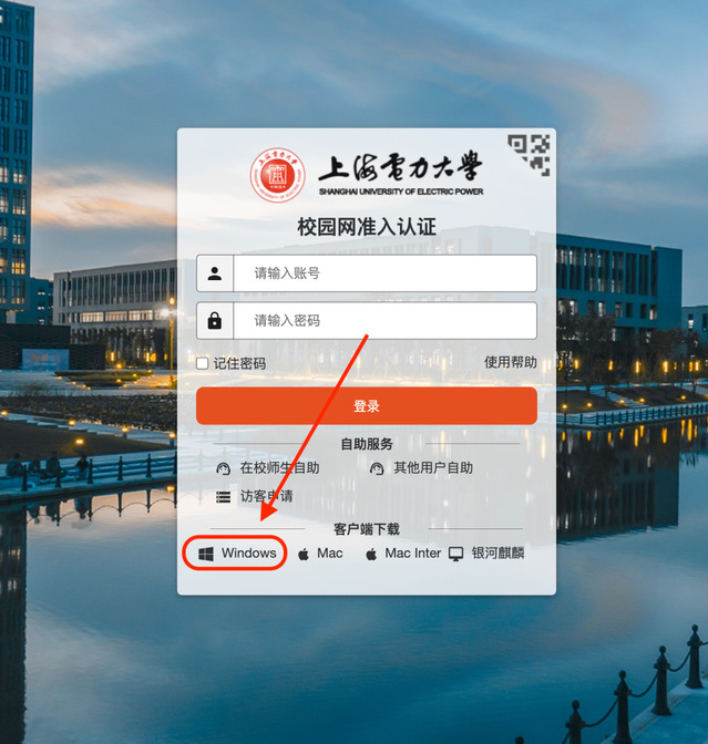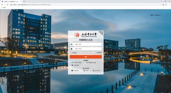 通过https://xyw.shiep.edu.cn认证界面上的“客户端下载”链接,选择”Windows”客户端。下载安装包,双击运行即可安装完成客户端。